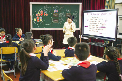 图一:小学英语公开课。图二:英语教学专家正在向全市英语教师介绍教学智能设备。