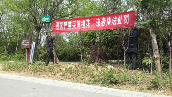 又到春色浓郁时,舜耕山风景区内漫山槐花即将盛开。然而往年每到槐花花季,大量市民蜂拥而至进入景区内采摘槐花,由于市民杀鸡取卵式的疯狂采摘,对舜耕山风景区内野生刺槐资源造成很大的破坏。为了保护风景区内野生刺槐资源不被破坏,我市舜耕山风景区管理处决定打一场“槐花保卫战”。