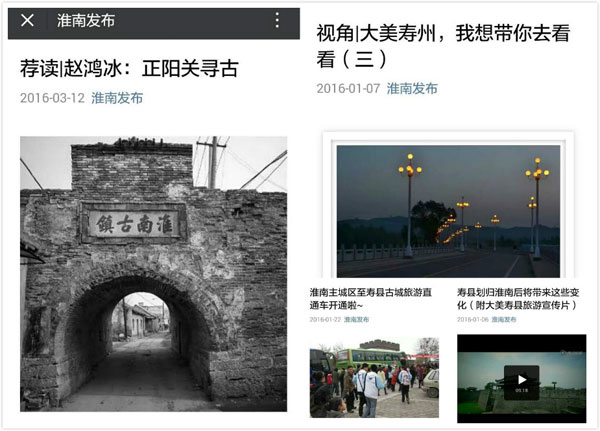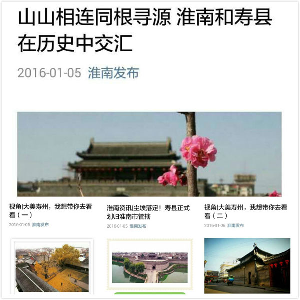 今年初寿县划归淮南市管辖后,“淮南发布”第一时间谋划相关网络宣传,相继推出《山山相连同根寻源 淮南和寿县在历史中交汇》、《尘埃落定!寿县正式划归淮南市管辖》、《寿县划归淮南后将带来这些变化(附大美寿县旅游宣传片)》、《视角|大美寿州,我想带你去看看》、《淮南最美的风景,你见过多少?(寿县篇)》、《荐读|赵鸿冰:正阳关寻古》等一系列稿件,宣传寿县划归淮南的重要意义,推介寿县历史文化、风土人情、旅游资源等,相关稿件阅读量浏览量突破50万人次,广受网友好评点赞,对加速寿县淮南融合营造了良好的网络氛围。