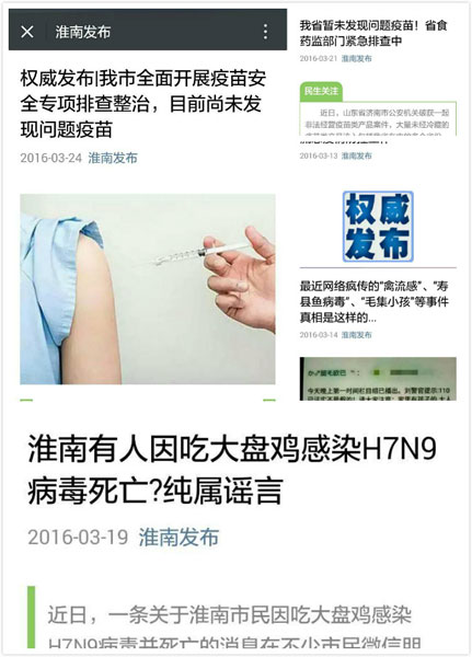 面对微信平台上放大负面情绪的“偏激共振”,面对跑在真相前面的“谣言法则”,“淮南发布”在“禽流感”、“问题疫苗”等重大、突发事件面前坚持不缺位、不失语,第一时间向社会公布信息,相继发布《【权威发布】我市积极做好禽流感疫情防控工作》、《最近网络疯传的“禽流感”、“寿县鱼病毒”、“毛集小孩”等事件真相是这样的……》、《淮南有人因吃大盘鸡感染H7N9病毒死亡?纯属谣言》、《权威发布|我市全面开展疫苗安全专项排查整治,目前尚未发现问题疫苗》等权威消息,及时回应网民关切,澄清事实,相关舆情得到快速有效处置,使网络中的询问、质疑声音得以迅速消除,在引导社会舆论方面发挥了巨大作用。