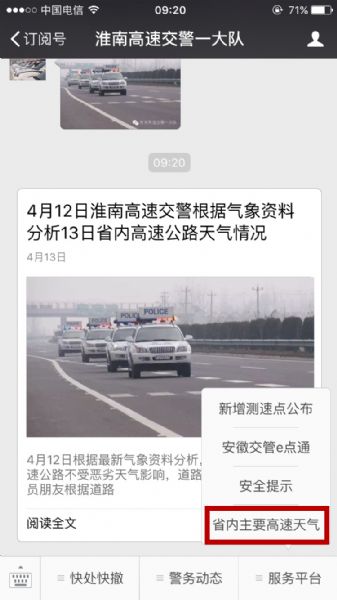 市交警支队高速大队在微信公众号中推出全省高速公路天气预报服务