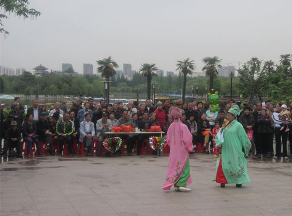 17日下午,雨后的龙湖景区景色优美,游人不断。景区一处广场上热闹非凡,来自淮南夕阳红秧歌队的老年朋友们正载歌载舞欢迎21位远道而来的客人。