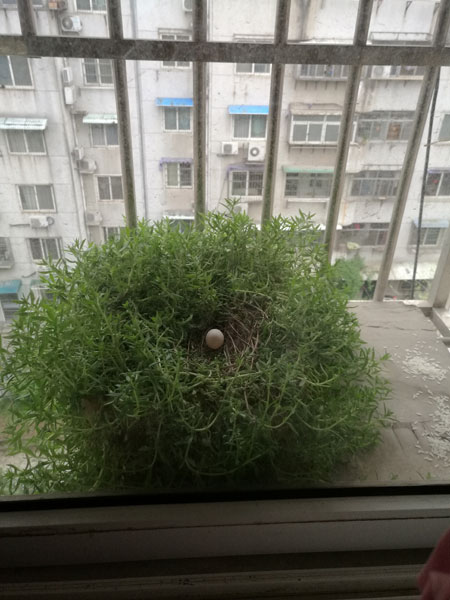 图一:4月2日拍摄下的大鸟在窗台上的花盆内下了一个鸟蛋