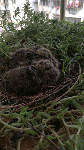 马先生躲在玻璃门后面,每天观察大鸟并用相机记录着大鸟的生活,他看见一只大鸟在窝内孵化,另一只大鸟就停在对面一幢楼房的阳台上,密切关注着这边的一举一动,像是放哨执勤的卫兵。经过近20天的孵化,4月22日,两只鸟蛋孵化出了小鸟,每天大鸟嘴里衔着虫子,窝里的小鸟张大嘴巴伸长了脖子,叽叽喳喳地等待喂食。