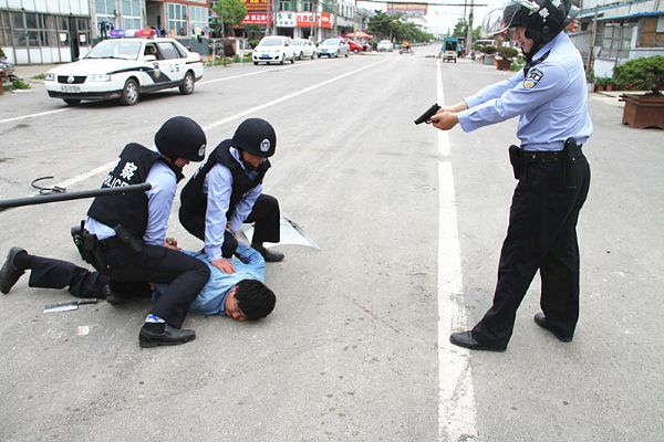 大约十来分钟后,“暴恐分子”被多路民警制伏,并被成功押解到当地派出所审讯。