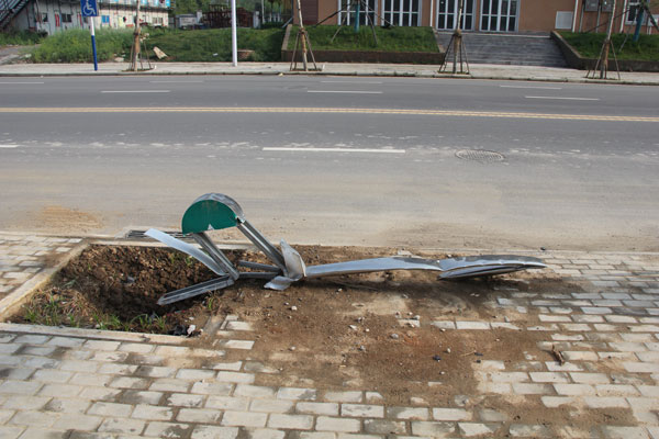 近日,市民致电淮河早报热线反映称:“林场路刚修建成不久,就有一个道路指示牌被损坏。新装的道路指示牌被轧成几段倒在路边,也没人前来维修更换,不仅起不到指示作用,对城市形象也会造成影响。”