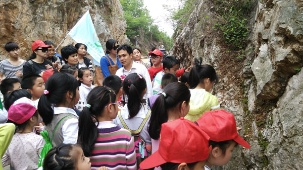 当日下午2时许,来自全市的30多个家庭在洞山宾馆西门集合,在群主的带领下开始沿着环山路向东进发。“孩子们你们看,这就是沉积岩,舜耕山主要是由这种岩石构成的。它是一层一层的,这主要是地壳运动时岩层遭受挤压造成的。” 在舜耕山一处岩石旁,来自市十一中的孙本刚老师向孩子们介绍舜耕山特有的地质地貌。随后,孙本刚还向孩子们解释沉积岩的特质,以及舜耕山形成的原因。“哦,原来几亿年前我们这里是一片汪洋大海,后来经过地壳运动才形成了陆地。”“我以前就听说过‘三叶虫’化石,原来它是存在于页岩当中,今天我可得好好找一找,说不定还能发现一块‘三叶虫’化石呢!”活动中,孩子们听了孙本刚老师的介绍后兴奋不已,一边沿路找寻着各种岩石,一边七嘴八舌地与同伴分享自己的心得。