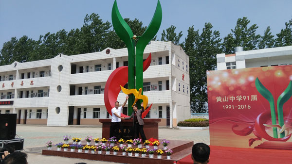 上午10时许,淮河早报、淮南网记者驱车十多公里来到了位于孔店乡马场附近的黄山中学。只见学校内彩旗飘扬,音乐阵阵,一片喜庆热闹的景象;全校师生整齐地坐在操场上,共同注视着中央的舞台。几段简短的讲话后,捐赠仪式正式开始了。捐赠者代表赵彬与学校负责人郑校长共同为捐赠的雕塑“春芽”进行了剪彩;随后,参与此次捐赠的20多名毕业生纷纷走上舞台,与旁边的雕塑进行合影留念。