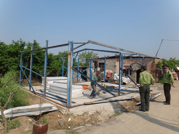 该处违章搭建位于高新区(山南新区)城市候机楼项目西侧,工地经常有工人到外面寻找地点就餐,当事人胡某就在自家门前平整场地搭建彩板房,准备经营大排挡。在执法人员耐心宣传下,当事人不仅自行拆除了违章搭建,还对执法人员及时制止减少损失表示感谢。