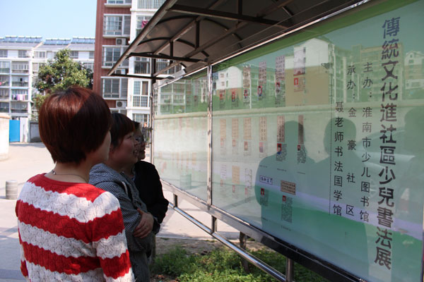 在金豪社区,淮河早报、淮南网记者看到,社区内的两处宣传橱窗内共展示了70多幅少儿书法作品,内容丰富,在每幅作品下面,都有小作者学习书法的心得体会。看这些八九岁的小朋友毛笔字都写的那么好,许多社区居民都竖起了大拇指,社区居民姚女士说:“少儿练习书法可以陶冶情操,我们欣赏书法作品也是一次感受传统书法优雅之美的过程,这样的书法展非常好。”