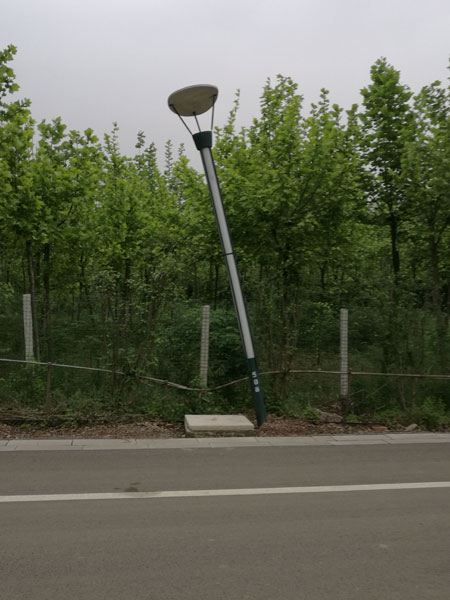 5月10日下午,淮河早报、淮南网记者接到市民王先生的来电,他说,在环山路银杏林附近有一杆路灯倾斜角度比较大,让人担心会倒下来。