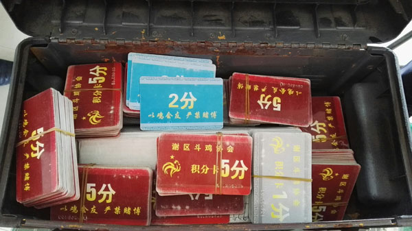 接到群众报警后,望峰岗派出所向分局汇报,同时进行秘密侦查,渐渐摸清了场所内的情况。此处是以斗鸡为幌子,实则展开聚众赌博的窝点。斗鸡的组织方为“谢家集区斗鸡协会”,名为娱乐活动,现场还放置了各种比赛奖杯,然而出入该场所的人都心知肚明,这是以斗鸡为形式的赌博,赌博开始后,由两方分别抱着两只鸡进入封闭的比赛场,参赌的人们根据胜负预判自行下注,赌哪方的鸡会斗赢。下注可以通过购买卡片的方式,有灰色、蓝色和红色三种颜色的不同卡片,最小下注额100元,上不封顶。了解到这些情况后,公安机关决定伺机对这一赌博团伙进行抓捕。