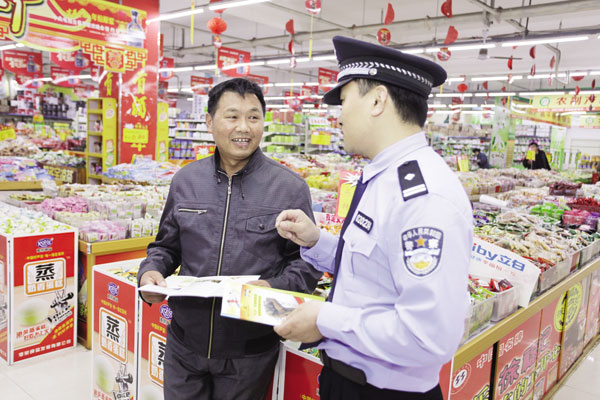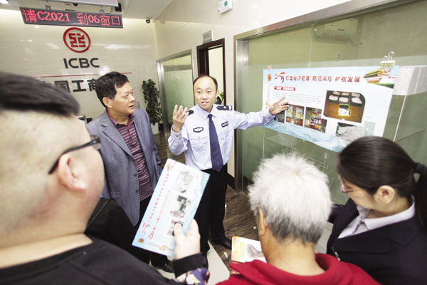 图一:民警在银行向群众宣传非法集资案例。图二:在超市,民警向市民介绍经济犯罪常见手法。