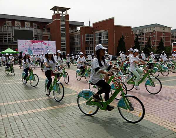 图:大学生志愿者骑行公共自行车,宣传低碳环保的出行理念