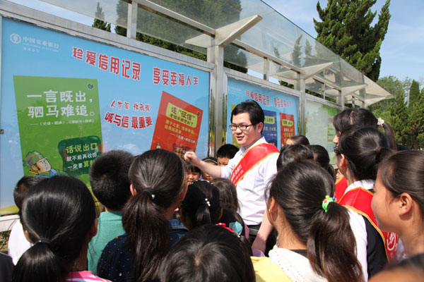 5月17日上午,农行淮南分行响应中国人民银行淮南市中心支行的号召,组织人员来到九龙岗第一小学开展“征信教育进校园 诚信美德从娃娃抓起”活动。在该校举办了“校园征信宣传工作站”揭牌仪式,设立了图文并茂“珍爱信用记录 享受幸福人生”橱窗宣传栏,标志着该行校园征信宣传工作正式启动。大通区九龙岗第一小学留守儿童较多,该行积极践行社会责任、支持农村教育事业发展,多年来,为九一小捐赠许多书籍、桌椅、电脑等物品,深受师生赞誉。