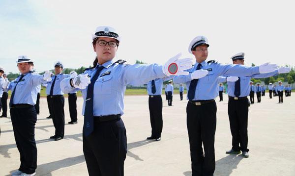 图为5月17日,交警顶着烈日在市国防动员训练基地进行交通指挥手势操练习。