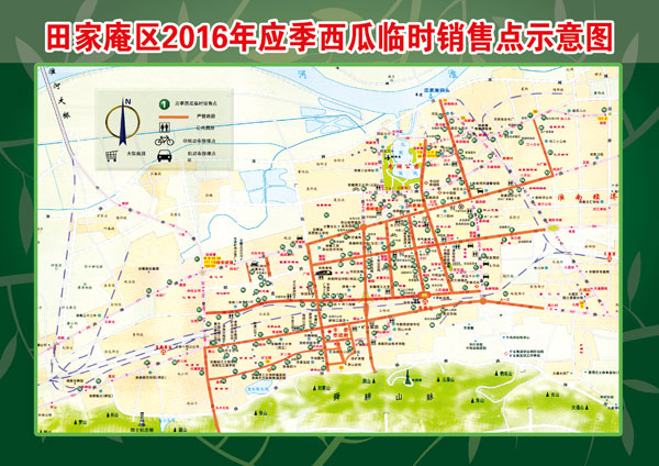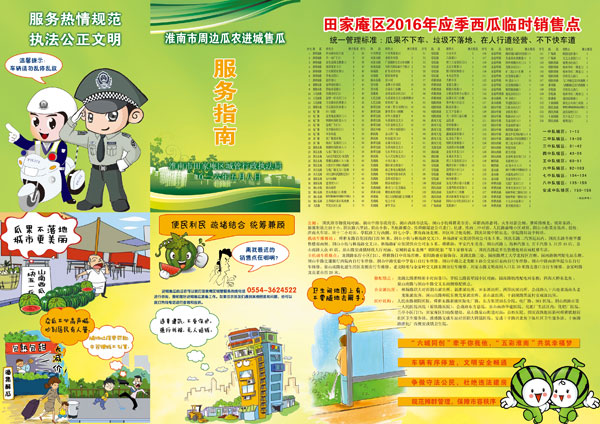 据了解,今年的“西瓜地图”上所标注的临时销售点总共有156处,数量较往年有所增加,主要分布在居民相对集中的路段、巷口、背街场地等,充分照顾到了瓜农售瓜的需求。与往年相比,2016版“西瓜地图”形式更活泼,内容更丰富,使用了大量的卡通漫画来宣传市容法律法规,倡导文明经营。同时,“西瓜地图”上还详细指出了公厕、车辆维修点、医疗机构等便民服务场所。此外,为了方便瓜农和市民辨识销售点,近期,该局在销售点附近醒目墙体立面上安置“淮南市田家庵区应季西瓜临时销售点”标牌,并明确标注了该销售点的序列号、投诉举报电话以及销售点起止日期等信息。