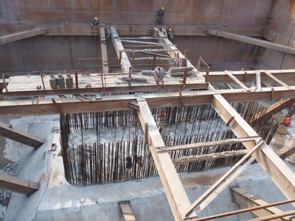 其中,北岸钢围堰分两次封底,封底用砼2000立方米,南岸钢围堰封底用砼2200立方米。此前,南岸39#主桥墩施工桩基直径2.5米,最长桩长105米,最大钻孔深度达到124米,远远大于淮河现有桥梁,这个“百米深桩”施工与“万吨排水钢围堰”下放施工是淮上淮河大桥两大技术难点。
