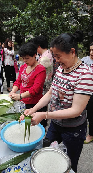 当日下午3时,金地国际城A区的休闲小广场上一片喧闹,金地社区的居民们正在这里进行一场包粽子大赛,每位选手面前都放着晶莹雪白的糯米以及清香四溢的粽叶,选手们的手中握着已经剪好线绳,蓄势待发。只听“嘟”的一声哨响,参赛选手立刻行动起来,只见粽叶在她们手中轻轻一握,轻松成了一个容器,将适量的糯米放入其中,再嵌入两颗蜜枣,灵巧的手带着粽叶上下翻飞,在空中划出一道道美丽的弧线。淮河早报、淮南网记者看到,每位选手包粽子的方法并不相同,但大家个个笑容满面,从容自如,动作娴熟。转眼间,一个个漂亮的粽子出现在大伙面前,一旁围观的居民不停地为她们加油打气,现场气氛十分热烈。