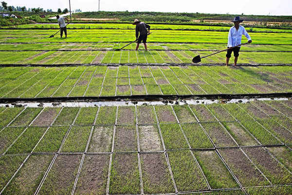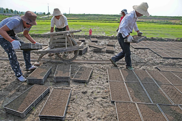 5月28日,谢家集区孙庙乡新庄村,淮南市方平农业机械作业农民专业合作社的村民们在操作水稻育秧机器,目前我市正处于小麦、油菜成熟收割期,村民们正抢抓时间育秧。据介绍,合作社今年所育秧苗可栽插水稻80多公顷。
