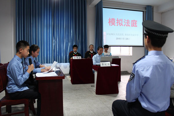 “现在开庭……”随着“审判长”敲响的清脆的法槌声,5月26日下午,田家庵区法院的“模拟法庭”在龙泉中学开庭,庭上审理了一起聚众斗殴案件。该校130多名初一师生进行观看。