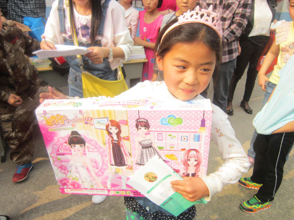 图:一位小朋友领到芭比娃娃,实现愿望。