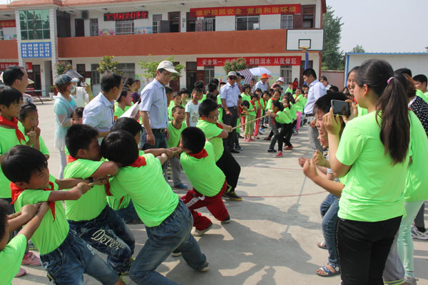 5月30日下午,凤台县顾桥镇王庄小学和王庄社区关工委为庆祝“六一”儿童节,联手在该校举办了庆“六一”文体娱乐活动。图为王庄小学的孩子们在举行拔河比赛。