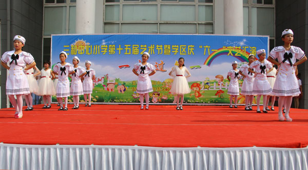 5月30日,三和中心小学的留守儿童们用自编自演的歌舞小品迎接“六一”儿童节。