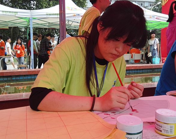 图三:游园会现场,学生正在进行手绘纸扇展示。