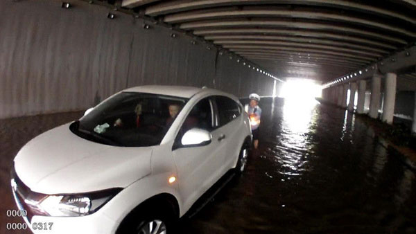 淮河早报、淮南网记者获悉,5月31日晚,我市普降大雨导致青桐大道淮南职教中心段下穿桥严重积水,多车于6月1日早6时被困。市交警支队公巡大队民警获知信息后,火速赶往现场。到达现场后,民警发现该下穿桥下已经有6辆汽车被困,为了查清楚积水深度,民警立刻脱下鞋子赤脚下水进行勘查。经查,现场积水最深处已经达到1米左右,为引导其他车辆避险分流,出警民警立刻在下穿桥入口处放置提示牌,警示过往车辆前方有积水、车辆请绕行。随后民警挽起裤腿再次趟水走向被困车辆,合力帮助司机将汽车推离积水路段。最终经过民警半小时的努力,6辆被困汽车均被推至安全地带。