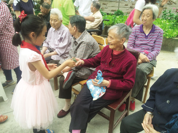 6月5日下午2时许,爱心志愿者来到寿春老年公寓,为这里的孤寡老人送去节目和香甜的粽子。到了公寓,大伙熟门熟路地分工,表演节目的忙着整理服装、补妆和音响器材;做服务的则是忙着搬桌子搬椅子,搀扶老人到院子里坐下;包粽子的则忙着端米、端粽叶、找绳子,做前期准备工作。