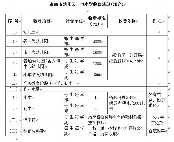 据了解,《淮南市幼儿园、中小学收费清单》是根据国家有关政策规定整理、汇集而成,各幼儿园、中小学均要按照所公示的收费项目和收费标准进行收费,凡《淮南市幼儿园、中小学收费清单》中未列入的一律不得收费。《淮南市幼儿园、中小学收费清单》中的作业本费实行多退少不补的原则,如有结余,如实退还。课本费、教辅材料费据实收取,不得预收。教辅材料在市教辅材料评议公告范围内由学生自愿购买,一教一辅,不得强行征订,价格按省教辅材料评议公告价格执行。