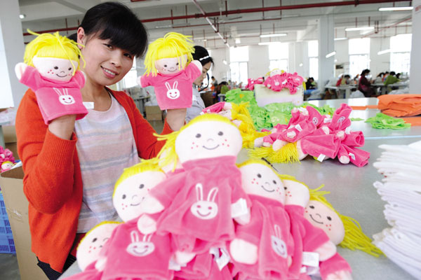在省级毛集经济开发区悠童玩具有限公司,农家女巧手加工布偶玩具,实现家门口就业。针对欧美国家对中国玩具技术贸易壁垒,该企业积极淘汰传统产品,加速产业转型升级,开辟国内新市场,解决当地农家女就业创业。图为农家女开心地展示出口布偶玩具。