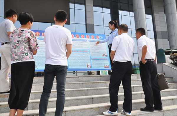 6月14日上午,潘集区法院门前新设置了多块展板,办事群众一边观看,一边仔细听着讲解员的讲解。当天,该院在门前开展以“依法禁毒 构建和谐社会”为主题禁毒宣传活动。