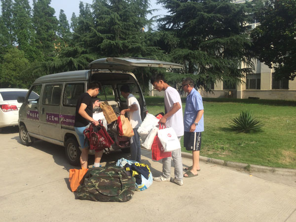 图:学子们把衣物装上车