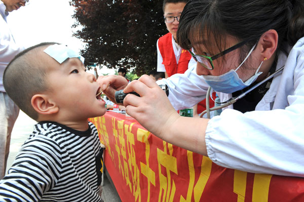 日前,市第一人民医院利用双休日组织党员医生走进龙湖公园开展义诊服务。该院在“两学一做”活动中,充分发挥党员医生先锋模范作用,走进公园、社区、乡村,发挥专业特长,为群众提供免费义诊服务,为党旗添光彩。图为市一院儿科党员医生范新凤为小朋友义诊。