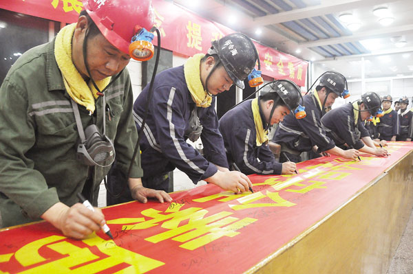 近日,围绕“强化安全发展观念,提升全民安全素质”安全生产月活动主题,新集二矿采取多种措施,狠抓安全检查防范工作,确保矿井安全高效发展。图为该矿一线职工参加安全签字仪式现场。