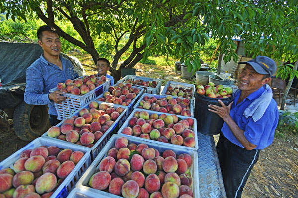 6月20日,在八公山区山王镇生态桃园,果农采摘鲜桃准备外运销售。初夏时节,八公山下生态旅游区内千亩桃园喜获丰收,果农陆续开始采摘鲜桃并供应市场。近年来,八公山充分发挥生态资源优势长板,积极发展桃、梨、樱桃、西瓜等经济作物,促进农民增收。