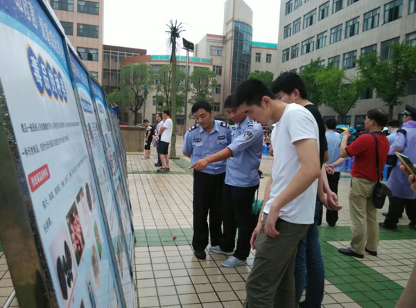 当日下午,在淮南职业技术学院校内广场上,早早就竖立起大量禁毒宣传展板,虽然下着雨,但仍聚集了众多学子观看。在现场,禁毒民警还向广大学子分发禁毒宣传单页,提醒大家自觉防范毒品。