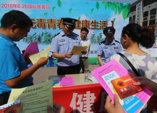 6月26日,凤台县公安局民警在城关镇街头向过往行人发放预防毒品犯罪宣传资料、讲解毒品对社会和家庭的危害。当日是第29个国际禁毒日,凤台县禁毒办各成员单位都举行了相关活动,宣传毒品危害,呼吁市民尤其是青少年远离毒品,珍爱生命。