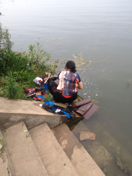 图为一名妇女在老龙眼湿地公园内刷鞋洗衣。