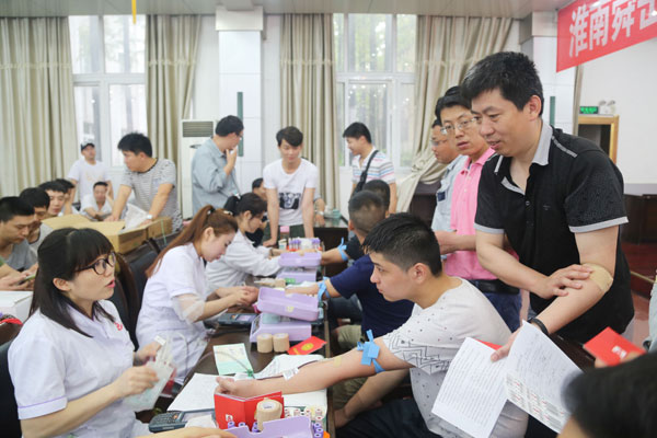 “义务献血是终身的荣誉,我要把这种公益爱心精神传递下去。”连续义务献血8次的淮南舜岳水泥公司职工于守连(右一)刚拔完针头,立刻走到儿子于浩然(右二)的身后,提醒儿子不要紧张,放轻松。这是近日在淮南舜岳水泥公司职工义务献血活动现场上的感人一幕。该公司勇担社会责任,在企业发展建设的同时,坚持回报社会,传递人间正能量。此次义务献血累计参与职工达129人,共计献血27570ml。