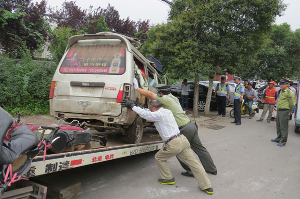 随着社会经济的发展,机动车已走进千家万户。但随着使用时间和公里数的增加,不少机动车也到达寿命的终点,而成为报废车。这些报废车一般都被送往报废机动车回收拆解企业进行拆解,但有的却被长期丢放在马路边、绿化带中,而成为“僵尸车”。在主城区,就有一些长期停放的“僵尸车”,不仅影响市容,还妨碍交通。近期,田家庵区城管和交警部门联合对这些“僵尸车”开展了集中清理行动,15辆“僵尸车”被拖离。