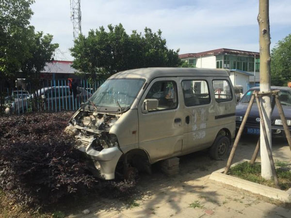 图一:洞山西路路北侧某汽修厂门前,一报废的面包车停放在绿化带中。