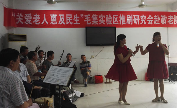 演出现场,毛集实验区推剧研究会的演员们表演了丰富多彩的戏曲节目,演唱了传统推剧《小包公》、《玲珑玉梳》和豫剧《穆桂英挂帅》、《大登殿》等10多首经典曲目,引得现场观众的掌声、欢呼声不断,听到高兴之处台下的老人们还会跟着轻声哼唱一段。演员们演得尽力,老人们看得过瘾。
