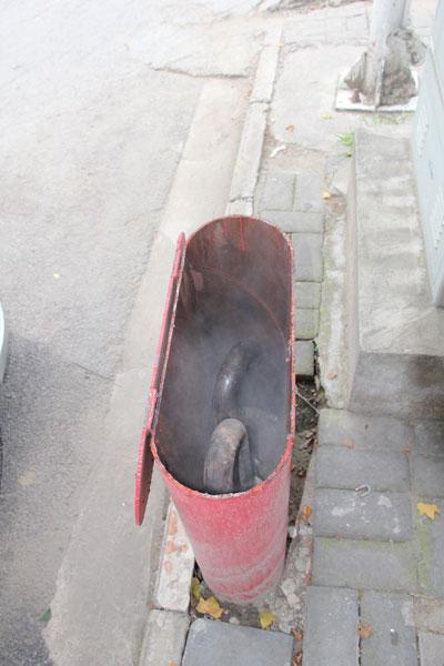 接报后,淮河早报、淮南网记者于7月11日上午来到水厂路。刚进入水厂路,就看到人行道边有一个红色的铁箱子,而且还有编号。淮河早报、淮南网记者下车仔细观察,该红色箱子使用钢板焊制,用手触摸感觉很烫,温度应该有60℃左右,打开箱子没有上锁的箱盖,可看见箱子内部有两根顶部弯曲的弯管,正对外冒出带有异味的蒸汽。淮河早报、淮南网记者沿路数了一下发现,这样的红箱子一共有12个,每一个都有编号。对于这些红色箱子的用处,淮河早报、淮南网记者也是一头雾水。