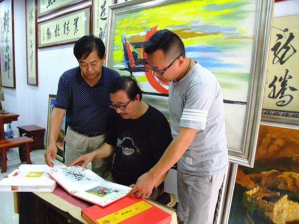 图:孙运良(中)和朋友一起欣赏精美的邮册