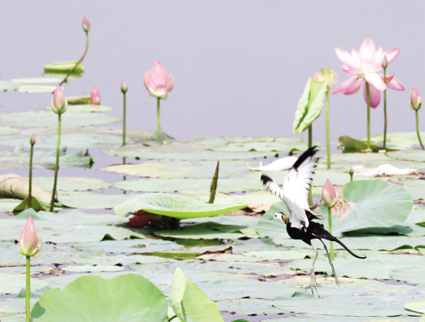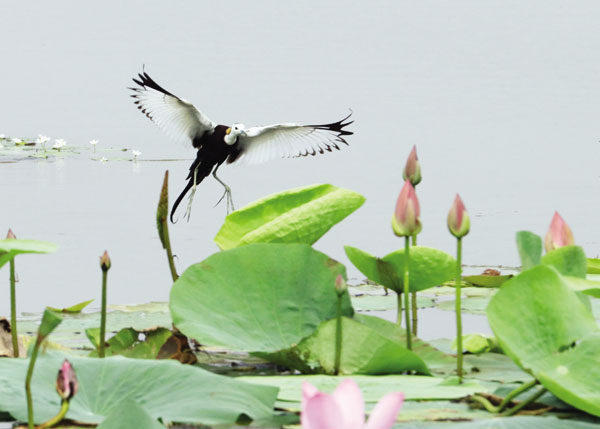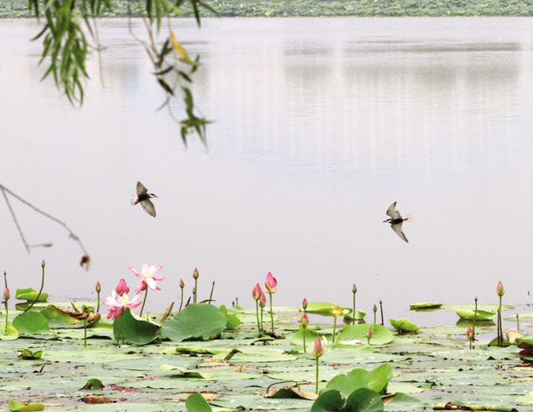 7月17日,大通区蔡城塘水域荷花竞放、鸟类翱翔,花鸟湖色连为一体、相映成趣。近年来,我市加大治理力度,生态环境不断改善,众多河湖沟渠成为各种鸟类的栖息地。