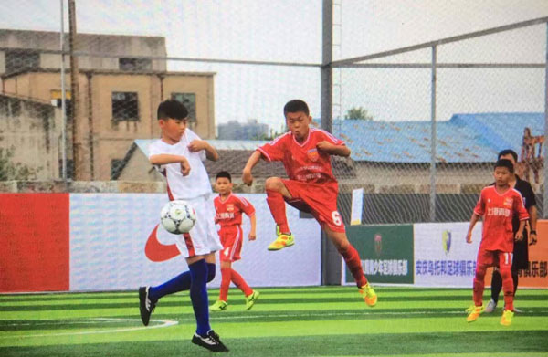 图一:上港青训基地淮南天翊足球俱乐部的小将们(红色队服)在绿茵场上拼搏