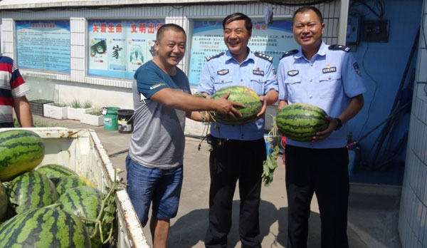 连日来,持续高温,市交警支队谢家集大队交警不畏烈日、酷暑,始终坚守在一线工作岗位上,认真指挥疏导交通,确保交通畅通无阻。7月25日,淮南市八公山水泥厂的员工自发准备了一车西瓜,带着对交警的敬意,驱车来到现场,向战斗在一线的交警进行慰问,谱写了一曲警民鱼水情的颂歌。